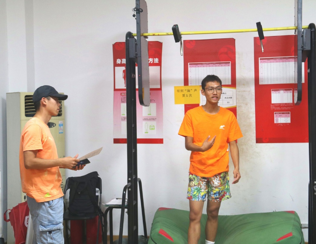 经过体院志愿者们的细致耐心的讲解后,辅导进入实操阶段,他们在各个负责项目岗位旁,针对性指导被抽测同学的测试动作,纠正错误动作。